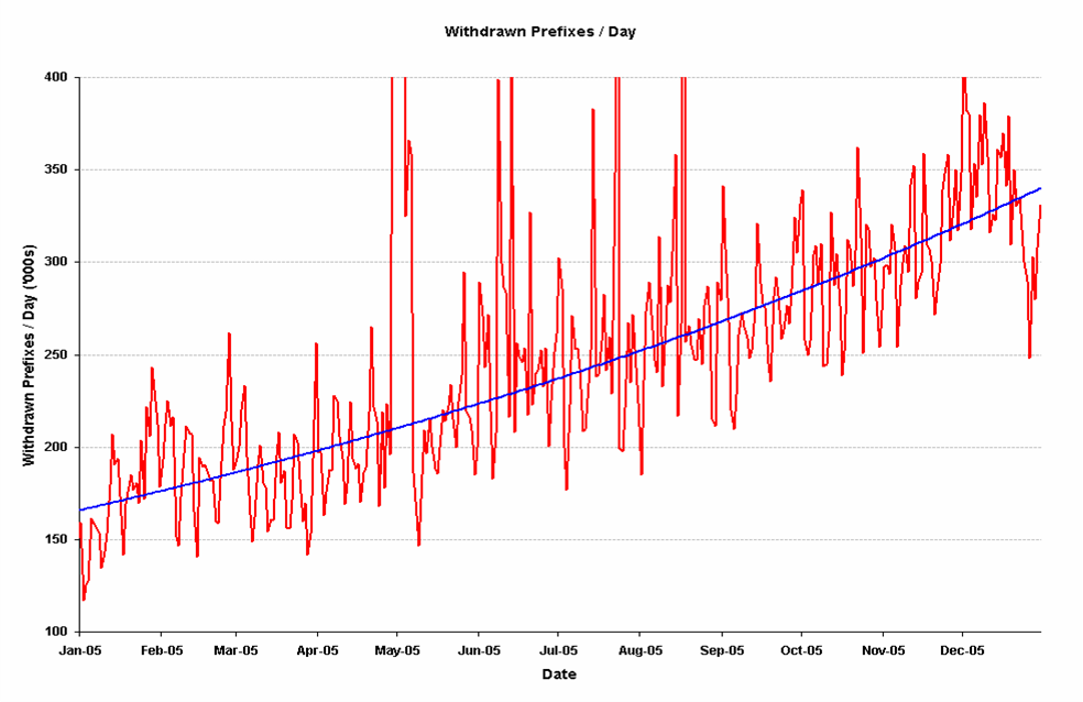 A similar trend is visible in the prefix withdrawal counts for 2005