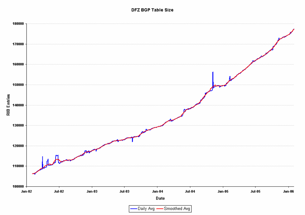 However the IPv4 trends for 2005 are a source of some concern. How big can the Internet grow in the coming years? Will we continue to be able to deploy routers in the default-free routing zone of the Internet that can comfortably route the Internet. Can we add additional functionality into the routing system and still stay within comfortable limits of the capability of the routing system and the routers? If you are an ISP and are considering purchasing new 'core' routers what capabilities should you specify for an operational lifetime of 2 years? How about for the next 5 years? And if you are a router vendor designing routing products for the market 3 or 5 years in the future what capacity should you build into the router? How much processing capacity should you plan for to support default-free BGP? How much memory is necessary?