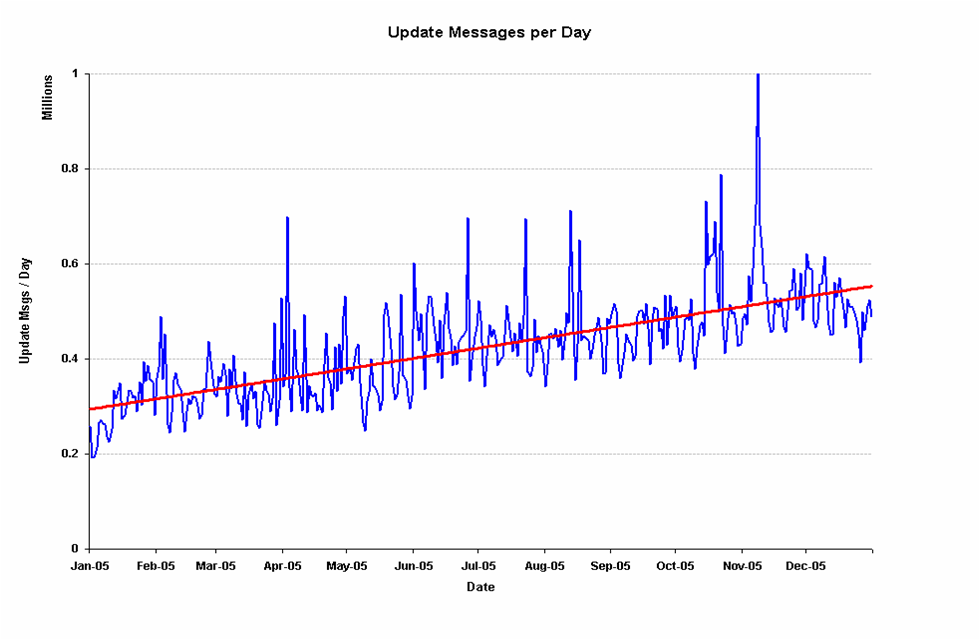 The other interesting observation is that BGP has 'good' days and "bad" days - one day in November recorded 1 million update messages in a single day. This is a very high level of variation, and it indicates a level of instability in the Internet that is not clearly evident at the user level, where most users tend to see a relatively stable and reliable Internet service.