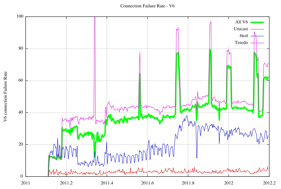 Teredo was highly unreliable at the time, showing a daily connection failure rate that was consistently greater than 40% of all Teredo connection attempts. Teredo’s relatively complex operation, and its objective to establish a usable NAT state, both count against it, and the resultant failure rate illustrates the proposition that Teredo was perhaps more of a liability than a positive contribution to IPv6. The 6to4 failure rate of between 20 to 20% by the end of 2011 was admittedly better than that of Teredo, but in absolute terms it is still unacceptable. Unicast IPv6 shows a “better” failure rate of some 5% of all connection attempts, but in absolute terms a 5% failure rate is still somewhat unacceptable, and certainly far worse than IPv4’s comparable failure rate of less than 0.5%.