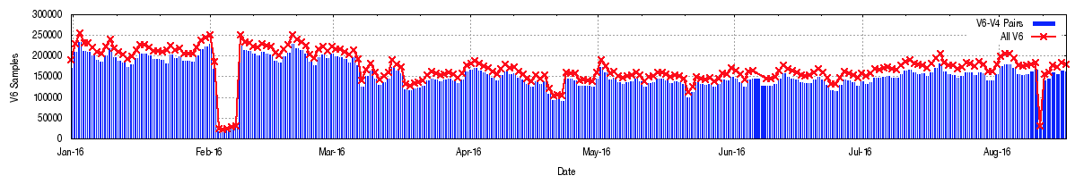 The third plot shows the number of measurement sample points that have been gathered per day. (Figure 7). The blue data points represent the number of IPv6 addresses see per day that have completed a connection and are able to be associated with an IPv4 address in a dual stack scenario. The red data points are the total of all unique IPv6 addresses seen per day, including those addresses that fail to complete a connection. Teredo and 6to4 IPv6 addresses are not included in this count.