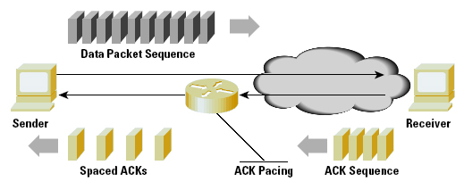 ACK Pacing: Each burst of data packets will generate a corresponding burst of ACK packets. The spacing of these ACK packets determines the burst rate of the next sending packet sequence. For long-delay systems, the size of such bursts becomes a limiting factor. TCP slow start generates packet bursts at twice the bottleneck data rate, so that the bottleneck feeder router may have to absorb one-half of every packet burst within its internal queues. If these queues are not dimensioned to the delay bandwidth product of the next hop, these queues become the limiting factor, rather than the path bandwidth itself. If you can slow down the TCP burst rate, the pressure on the feeder queue is alleviated. One approach to slow down the burst rate is to impose a delay on successive ACKs at a network control point (Figure 3). This measure will reduce the burst rate, but not impact the overall TCP throughput. ACK pacing is most effective on long delay paths, and it is intended to spread out the burst load, reducing the pressure on the bottleneck queue and increasing the actual data throughput.
