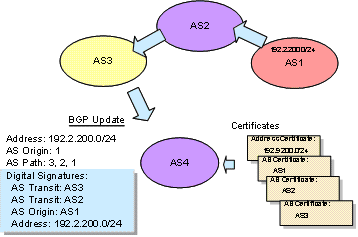 The same certificate structure would allow an entity to attach a digital signature to a BGP update asserting that it has the right to use that AS number as a route object. The associated certificate that includes the AS number as part of the certificate extension, with its matching public key, would allow a third party to validate the AS number as being a valid part of a route object.